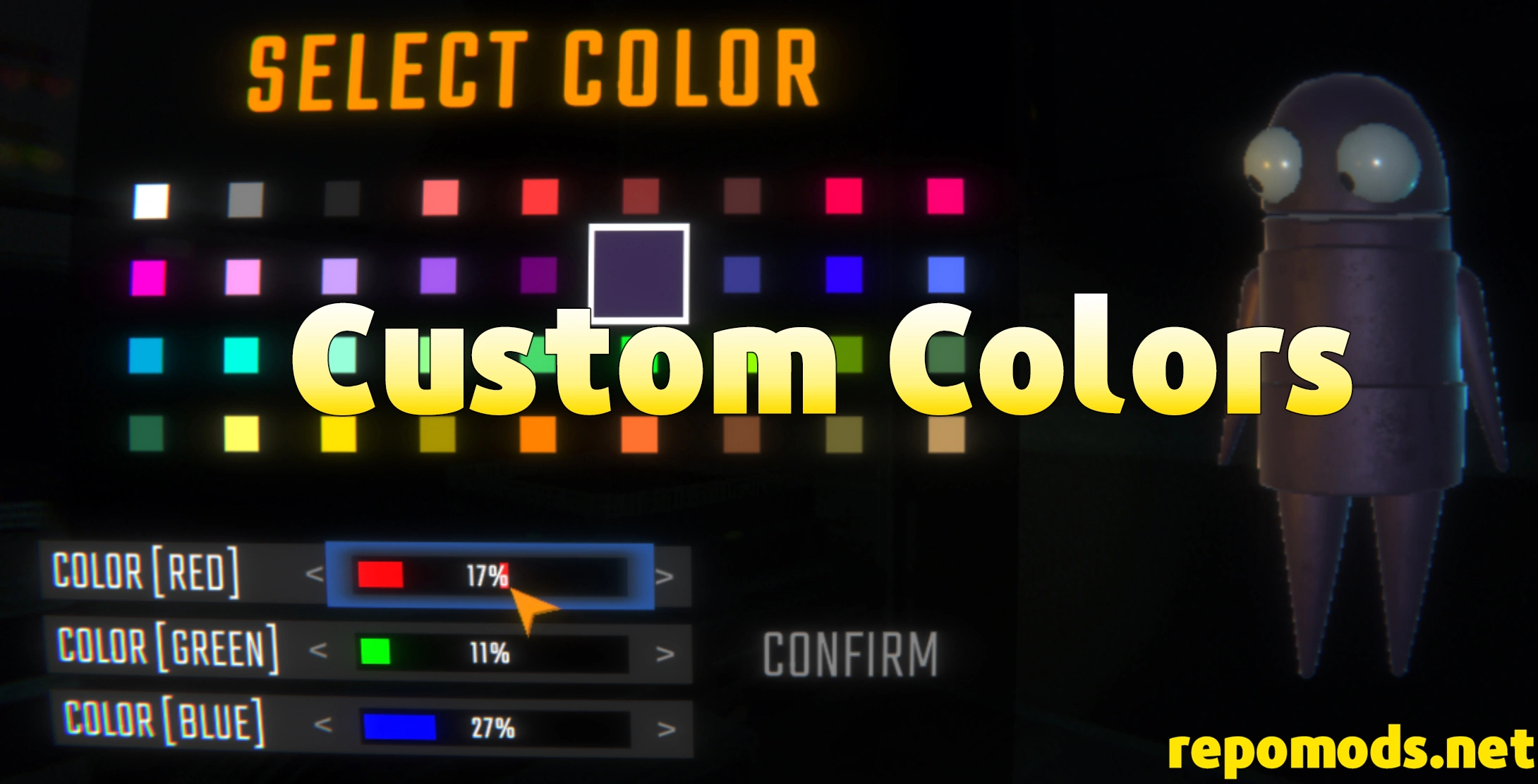 REPO CustomColors mod adds RGB color sliders to the Select Color page for full player customization. The mod also syncs custom colors with other players using the CustomColors mod. Players without the mod installed will see your last selected default color instead.
